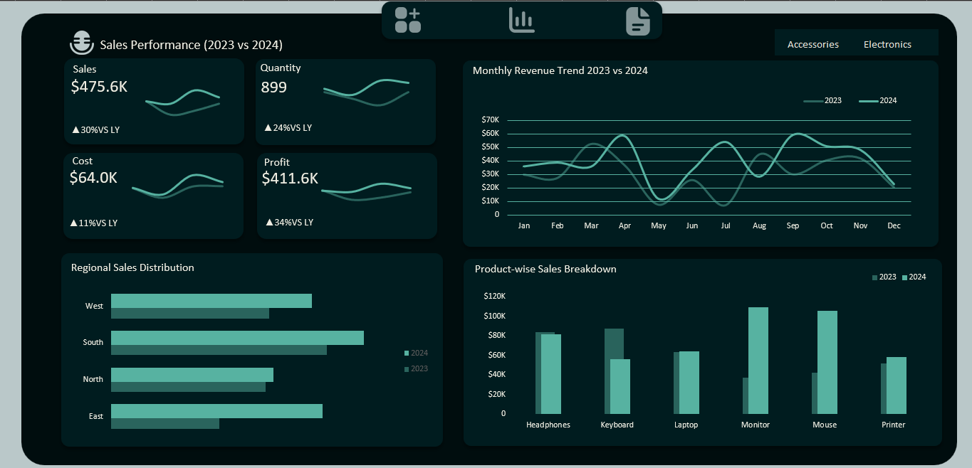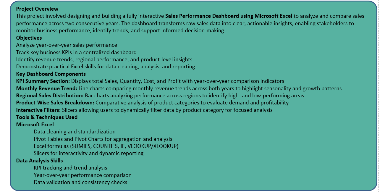 Created an interactive Excel dashboard to analyze year-over-year sales, revenue, profit, and product/region performance. Used Pivot Tables, charts, formulas, and filters to deliver dynamic, actionable insights for business reporting.